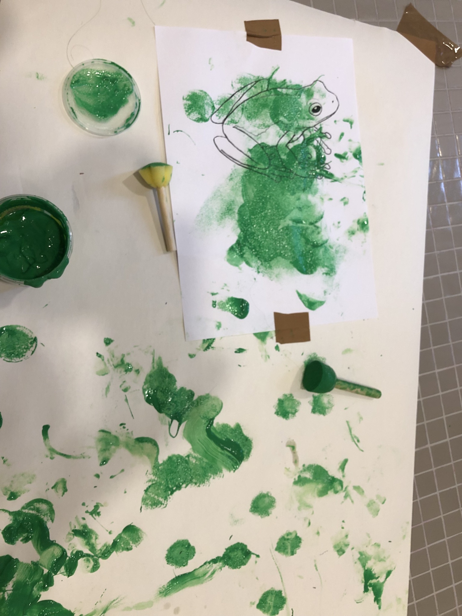 3) maalimine: rohelise näpuvärvi ja erinevate svammide-pintslitega värvimine. Kuna Väikemehe soovil oli iga päev kunstitund, siis sai ta proovida nii “konna roheliseks värvimist” kui ka lihtsalt paberile värvimist. Kõige suuremaks väljakutseks on hetkel see, et ta värviks vaid etteantud alale ehk siis paberile ja mitte põrandale.